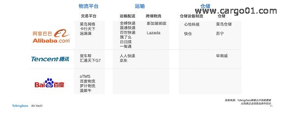 阿里做為國內(nèi)電商的領(lǐng)軍廠商,和物流行業(yè)關(guān)系較為密切。除搭建菜鳥網(wǎng)絡(luò)物流平臺外,在運(yùn)輸和倉儲領(lǐng)域也積極布局。騰訊從投資數(shù)量來看不如阿里,但也已經(jīng)覆蓋了物流平臺、倉儲和運(yùn)輸三大版塊;百度目前以投資物流平臺為主。