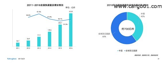 2011年~2016年,中國快遞行業(yè)持續(xù)以50%左右的增長率高速增長,目前已成為世界第一快遞大國。2016年全球700億件快遞中,中國貢獻(xiàn)300億件,占比40%左右,快遞業(yè)總收入也首破4000億大關(guān)。