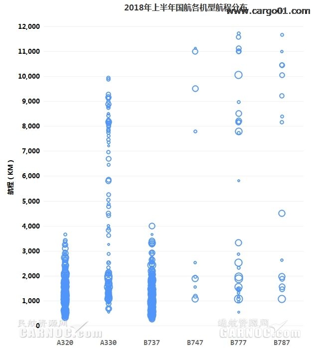 2018年上半年,國航A320和B737機(jī)型航程分布相似,平均航程接近,A320平均航程1363KM,B737平均航程1260km;兩種機(jī)型的航程均在4000km以下,B737執(zhí)飛航班73.1%航程在1500km以下,A320執(zhí)飛航班63.6%航程在1500km以下。