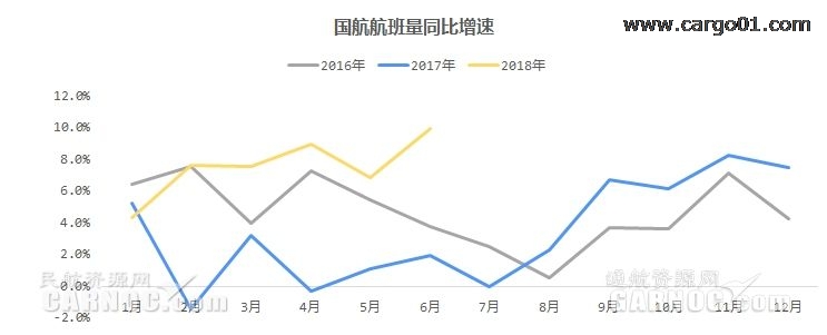 2016年以來,國航執(zhí)飛航班量在波動中上升,從近兩年表現(xiàn)來看,下半年增速較為穩(wěn)定,相比前兩年,2018年上半年增速有所提升且更為穩(wěn)定。
