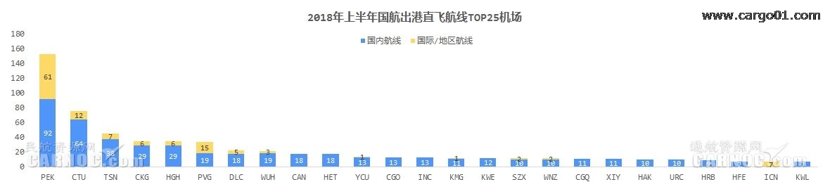 2018年上半年國航出港直飛航線TOP25機(jī)場中,有一個國外機(jī)場(首爾仁川,7條出港直飛航線)。