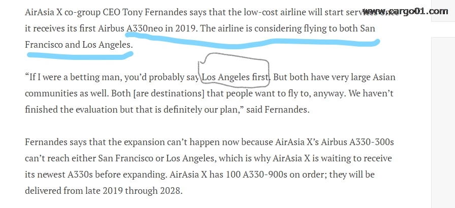 據(jù)Aeronauticsonline報道,亞航總裁Tony Fernandes表示,亞航在2019年接收首架空客A330neo后,將開通舊金山和洛杉磯航線。