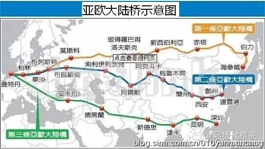 2、東起江蘇連云港西至荷蘭鹿特丹的新歐亞大陸橋鐵路運(yùn)輸(也稱第二歐亞大陸橋)。