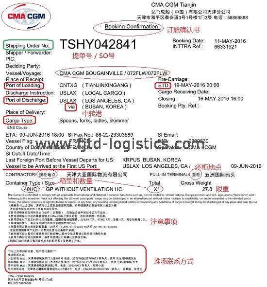 船公司的Logo和名稱以及Shipping order 或Booking Confirmation的字樣,S/O號(hào)(Shipping order No.通常也是提單號(hào)),船名/航次(vessel/voyage),起運(yùn)港POL,卸貨港POD,中轉(zhuǎn)港(via如有),預(yù)計(jì)開船日期ETD,截港日期(closing date),截補(bǔ)料時(shí)間(SI cut off),箱型和箱量(container type/size),提空柜地點(diǎn)(contractor),還重柜地點(diǎn)(full-in terminal),最大重量(Gross Weight Limit),堆場(chǎng)聯(lián)系方式以及注意事項(xiàng)等。