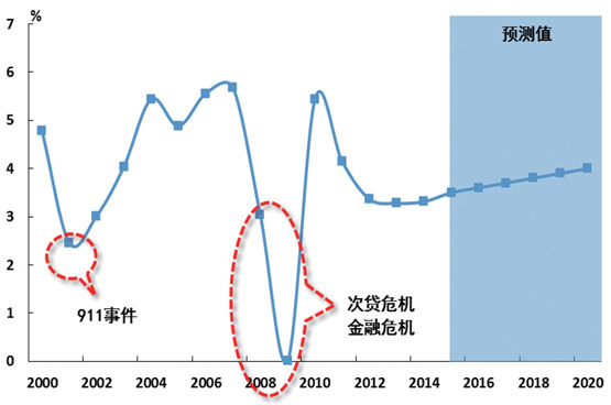 發(fā)展中經(jīng)濟(jì)體地位繼續(xù)提升,經(jīng)濟(jì)增長的引擎回歸發(fā)達(dá)經(jīng)濟(jì)體。2000-2007年發(fā)展中經(jīng)濟(jì)體年均增速為6.7%,高于世界平均增速2.3個(gè)百分點(diǎn)。受到金融危機(jī)沖擊,發(fā)達(dá)經(jīng)濟(jì)體出現(xiàn)大幅度的下滑(如圖2所示),歐美日經(jīng)濟(jì)同時(shí)面臨巨大沖擊甚至出現(xiàn)萎縮,發(fā)展中經(jīng)濟(jì)體雖然經(jīng)濟(jì)增速有所下降,但明顯好于發(fā)達(dá)經(jīng)濟(jì)體,發(fā)展中經(jīng)濟(jì)體特別是中國一度扮演了世界經(jīng)濟(jì)增長引擎的角色。依托技術(shù)優(yōu)勢,發(fā)達(dá)經(jīng)濟(jì)體增速呈現(xiàn)回升態(tài)勢,而發(fā)展中經(jīng)濟(jì)體增速將有所放緩,與世界經(jīng)濟(jì)平均增速差異明顯縮小到1.1個(gè)百分點(diǎn)。預(yù)計(jì)“十三五”期發(fā)達(dá)經(jīng)濟(jì)體的年均增速為2.5%,發(fā)展中經(jīng)濟(jì)體為4.9%(如圖2所示)。按照對世界經(jīng)濟(jì)增長的絕對凈貢獻(xiàn)來計(jì)算,經(jīng)濟(jì)增長引擎開始回歸到發(fā)達(dá)經(jīng)濟(jì)體,這意味著相對于集裝箱而言,大宗貨物海運(yùn)需求減緩將更加明顯。