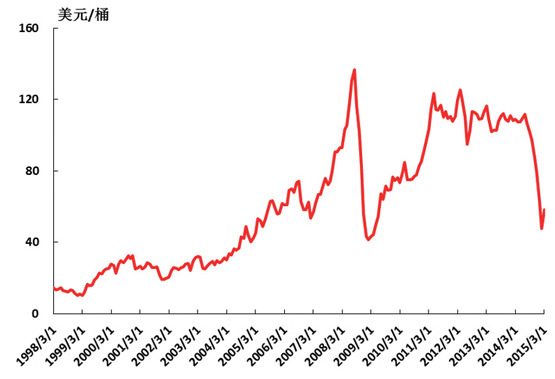 大宗資源類價(jià)格進(jìn)入一輪低谷。在上一輪世界經(jīng)濟(jì)快速增長的帶動(dòng)下,對石油、鐵礦石等資源類商品需求快速增長,天平向供給方傾斜,推動(dòng)了資源價(jià)格大幅度上漲(如圖3和圖4所示),同時(shí)也刺激資本對資源開發(fā)、生產(chǎn)投入大幅度增長。在世界經(jīng)濟(jì)增速放緩、生產(chǎn)率效率持續(xù)提高和日益注重節(jié)能減排的背景下,需求減弱,而產(chǎn)出穩(wěn)定增長,供需關(guān)系出現(xiàn)了失衡,天平向需求方傾斜,資源價(jià)格開始大幅下跌。石油價(jià)格一度跌至40多美元,中國鐵礦石到岸價(jià)也跌至60-70美元的水平(如圖3和圖4所示)。從多個(gè)機(jī)構(gòu)的預(yù)測來看,今后一個(gè)時(shí)期大宗商品價(jià)格很難有大幅提升。
