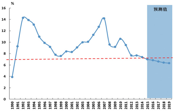 經(jīng)濟(jì)進(jìn)入中速增長階段。圖5顯示了1990年以來我國經(jīng)濟(jì)增速的變化。2000-2010年我國經(jīng)濟(jì)、對外貿(mào)易分別保持了年均10.5%和20.2%的增長,2010年后呈現(xiàn)逐步放緩態(tài)勢,2014年降為7.4%。當(dāng)前,我國經(jīng)貿(mào)發(fā)展面臨十分復(fù)雜的國際環(huán)境,內(nèi)部則處于“三期”疊加期。隨著新型工業(yè)化、信息化、農(nóng)業(yè)現(xiàn)代化和城鎮(zhèn)化“新四化”的不斷推進(jìn),以及市場機(jī)遇、投資機(jī)遇、綠色機(jī)遇和對外合作機(jī)遇的不斷擴(kuò)大,為我國經(jīng)濟(jì)增長提供了巨大潛力和回旋空間。這些發(fā)展環(huán)境變化使我國經(jīng)濟(jì)發(fā)展進(jìn)入新常態(tài),預(yù)計(jì)2015年GDP增長約7%,“十三五”期間經(jīng)濟(jì)平均增速只要保持在6.6%(如圖5所示),即可實(shí)現(xiàn) 2020年GDP總量比2010年翻一番的戰(zhàn)略目標(biāo),按照人均GDP水平測算,我國將進(jìn)入高收入國家行列,對海運(yùn)需求質(zhì)量將全面提高。
