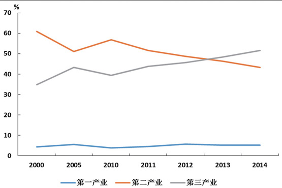 產(chǎn)業(yè)與區(qū)域經(jīng)濟(jì)結(jié)構(gòu)調(diào)整,第三產(chǎn)業(yè)成為經(jīng)濟(jì)增長的主要?jiǎng)恿?。隨著經(jīng)濟(jì)社會(huì)的進(jìn)步,經(jīng)濟(jì)結(jié)構(gòu)不斷優(yōu)化,第三產(chǎn)業(yè)所占比重逐步提高,并于2013年首次超過第二產(chǎn)業(yè)(如圖6所示)。未來,經(jīng)濟(jì)將進(jìn)入中速增長階段,而第三產(chǎn)業(yè)可望保持相對較快的增長,占GDP比重持續(xù)提高,結(jié)構(gòu)不斷優(yōu)化。從三駕馬車的貢獻(xiàn)來看,外貿(mào)和投資的作用逐漸減弱,經(jīng)濟(jì)增長主要依托消費(fèi)的增長。消費(fèi)的增長并不能像第二產(chǎn)業(yè)那樣直接拉動(dòng)運(yùn)輸需求量的增長,這一態(tài)勢使得運(yùn)輸需求對GDP增速彈性減弱。