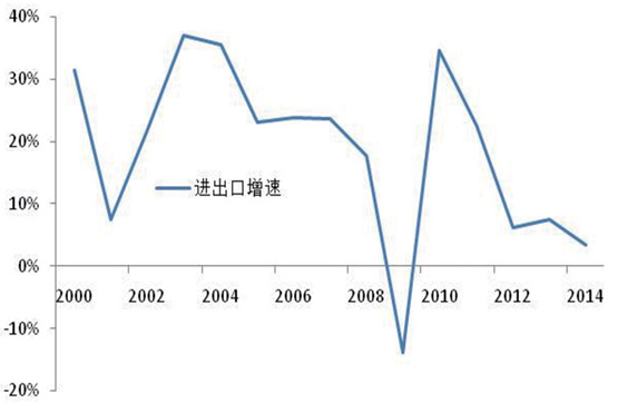 外貿(mào)保持穩(wěn)定增長,與經(jīng)濟(jì)彈性進(jìn)一步下降。在加入WTO的帶動(dòng)下,2000-2007年我國外貿(mào)進(jìn)出口總額保持了24.3%的年均增長(如圖8所示),與 GDP的彈性系數(shù)高達(dá)2.25,明顯高出世界1.5的平均水平,成為世界重要經(jīng)貿(mào)大國。受到金融危機(jī)沖擊和全球貿(mào)易放緩的影響,面對國內(nèi)外復(fù)雜形勢,2007-2014年我國對外貿(mào)易仍保持較快發(fā)展,外貿(mào)進(jìn)出口總額年均增速達(dá)到10.2%,國際貿(mào)易地位不斷提高,成為世界第一貨物貿(mào)易大國。隨著貿(mào)易依賴度的提高,進(jìn)出口彈性逐步下降,由2.25下降為1.16。“十三五”期間我國對外貿(mào)易發(fā)展將面臨更加復(fù)雜的國際環(huán)境,將逐步轉(zhuǎn)入平穩(wěn)發(fā)展階段,與 GDP的彈性下降為1.0,外貿(mào)進(jìn)出口總額增速保持在6.6%與GDP相當(dāng)?shù)乃健?br />  貿(mào)易區(qū)域結(jié)構(gòu)不斷優(yōu)化,貿(mào)易伙伴保持多元化趨勢。隨著我國經(jīng)濟(jì)社會(huì)發(fā)展水平的提高,貿(mào)易呈現(xiàn)多元化發(fā)展趨勢,特別是金融危機(jī)后,亞洲、歐洲和北美洲占貿(mào)易比重由2007年的89.6%逐步降為2014年的85.1%,美國、歐盟和日本所占比重由41.1%降為34.4%,而非洲、拉丁美洲所占貿(mào)易比重則由 8.1%上升為11.3%。隨著世界貿(mào)易格局的調(diào)整,以及我國“一帶一路”戰(zhàn)略的推進(jìn),對外貿(mào)易結(jié)構(gòu)將進(jìn)一步優(yōu)化,與東盟、非洲等海上絲綢之路沿線國家貿(mào)易比重進(jìn)一步上升。
