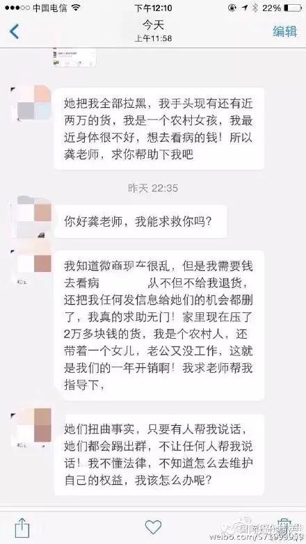 今日,有一位做微商的寶媽向知名電商自媒體人龔文祥求救,她說自己做微商屯了兩萬元的貨,而自己又來自農(nóng)村,兩萬元的貨款相當(dāng)于自己一年的開銷了。自己最近生病了,可是她之前加入的團(tuán)隊(duì),卻不愿意給她退款。真可謂是欲哭無淚啊,詳細(xì)內(nèi)容看下面的圖片: