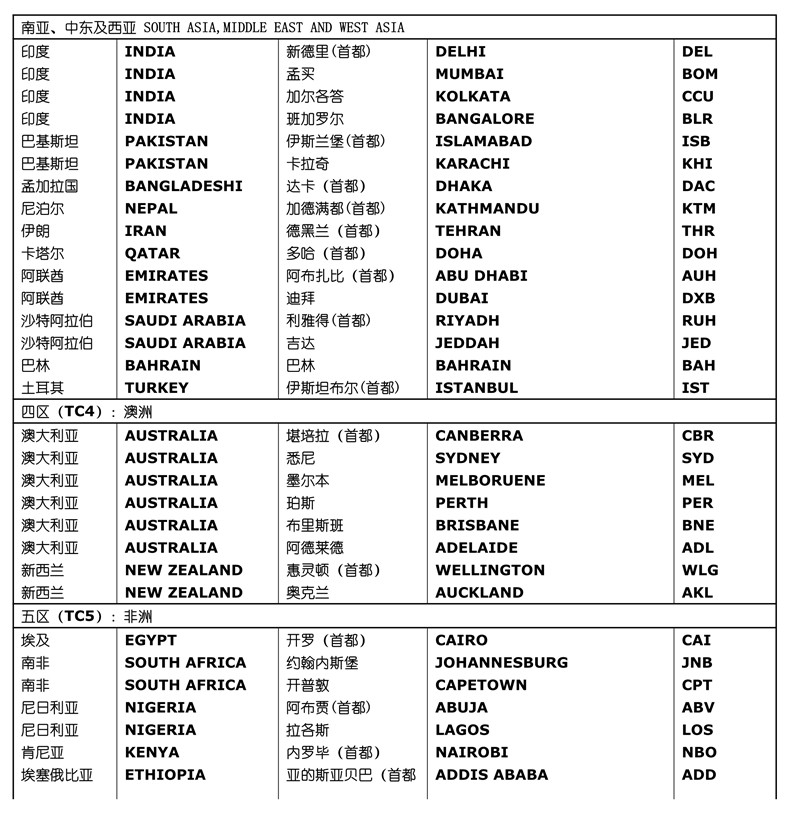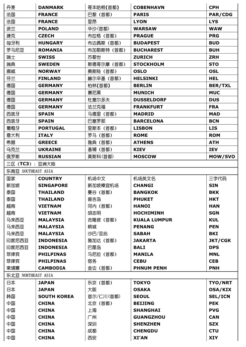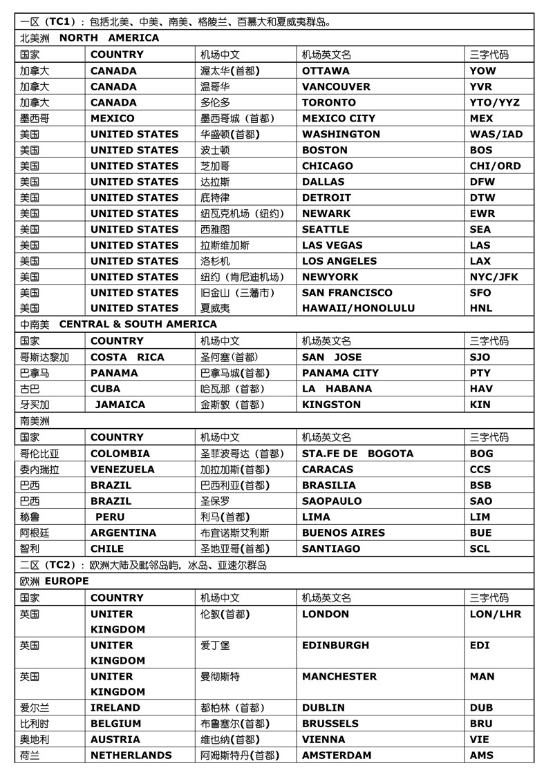 機(jī)場代碼由IATA規(guī)定,每個代碼對應(yīng)一個機(jī)場。它由三個字母組成。如PEK表示北京首都國際機(jī)場,NKG表示南京祿口國際機(jī)場,NRT表示東京成田國際機(jī)場,CAI表示埃及開羅機(jī)場等。