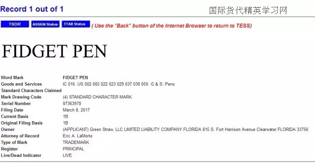減壓筆(Fidget Pen)專利方面因為存在18個月以上檢索盲期的原因,暫時尚未浮現(xiàn),但是在商標(biāo)方面,美國已申請了Fidget Pen在16類文具用品,歐盟和英國均沒有相同商標(biāo)申請,中國有“fidget”一詞申請了16類文具用品,日本有“fidget”申請了28類玩具項目,但是都尚未核準(zhǔn)注冊。