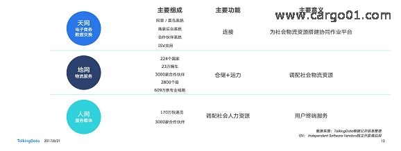 菜鳥物流網(wǎng)可拆分成天網(wǎng)、地網(wǎng)和人網(wǎng)3大版塊。天網(wǎng)是由數(shù)據(jù)驅(qū)動的云供應(yīng)鏈協(xié)同平臺,強(qiáng)調(diào)電子商務(wù)及物流數(shù)據(jù)的交互和分享;地網(wǎng)是借由龐大的地面網(wǎng)絡(luò)不斷聚集貨物、人氣,讓天網(wǎng)的數(shù)據(jù)能力落地;人網(wǎng)是主打“最后一公里”物流服務(wù)和基于消費(fèi)者真實(shí)生活中各種場景下的便民服務(wù)。