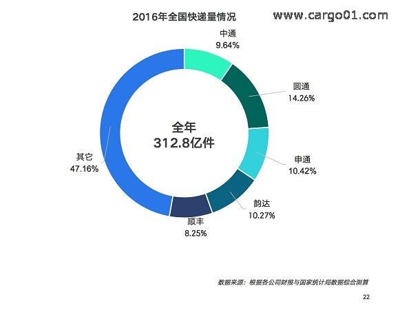 以順豐、圓通、申通、中通和韻達(dá)主導(dǎo)的快遞行業(yè),已形成了自己的市場格局。2016年快遞市場Top 5企業(yè)的業(yè)務(wù)量占據(jù)了中國快遞總體業(yè)務(wù)量的一半以上。