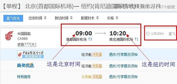 為什么總飛行時間是“13h20m”?因為北京時間和紐約時間的時差是12小時——紐約時間比北京時間晚(慢)12個小時。于是,12個小時+(10:20-09:00)=13小時又20分鐘。
