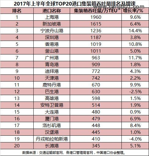根據(jù)榜單數(shù)據(jù), 2017年上半年全球港口集裝箱吞吐量排名前20名分別是: