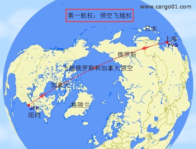 比如:上海(PVG)一 紐約(JFK),中途飛越俄羅斯和加拿大領空,那就要和俄羅斯和加拿大簽訂領空飛越權,獲取第一航權,否則只能繞道飛行,增加燃料消耗和飛行時間。有人可能會問:上海飛紐約不是飛越太平洋嗎?怎么會飛越俄羅斯和加拿大?因為地球是球體,上海到紐約飛“北極航線”距離最短,所以有的航班是這樣飛的。